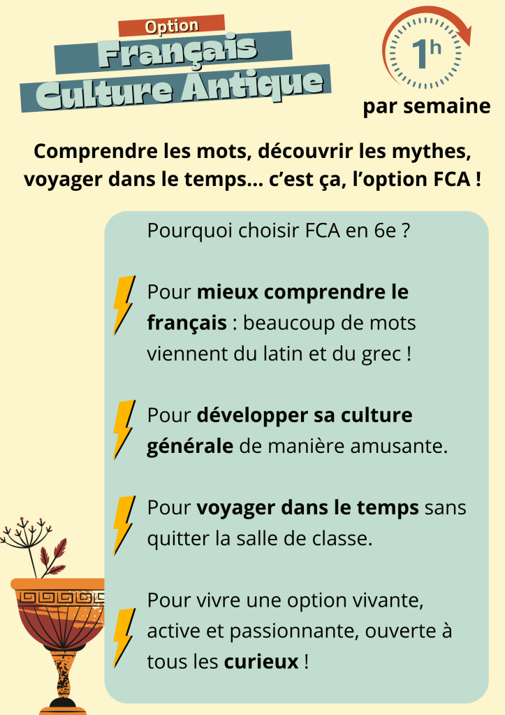 Il est possible de choisir une option liée à culture antique dès la 6e : l’option FCA (Français et Culture Antique).